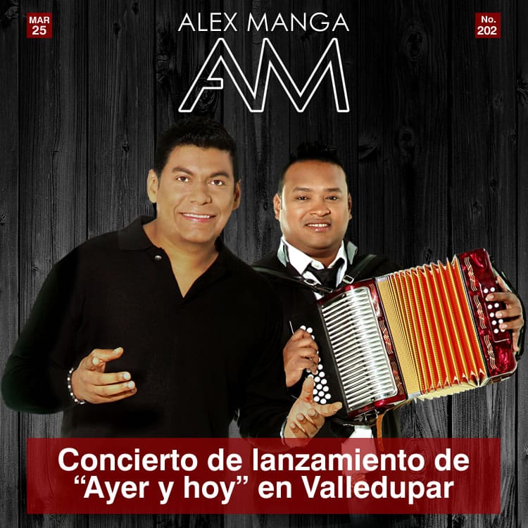 Ahora sigue el tan esperado concierto de lanzamiento de Ayer y hoy que se llevará a cabo este viernes 27 de marzo en Valledupar, allí el público vallenato podrá escuchar en vivo todos los temas de este trabajo discográfico de ALEX MANGA junto a su compañero ANDRÉS “EL NENO” BELEÑO.
